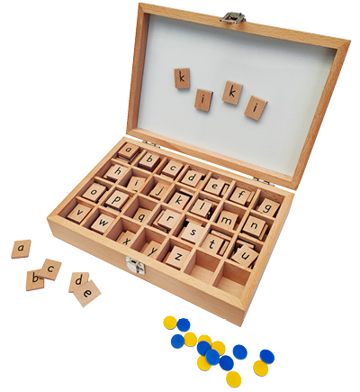 Tijdens de lessen gebruiken de kinderen regelmatig hun letterdoos met magnetische letters en fiches. Daarmee vormen ze hun eerste woorden en duiden ze klinkers en medeklinkers aan.
